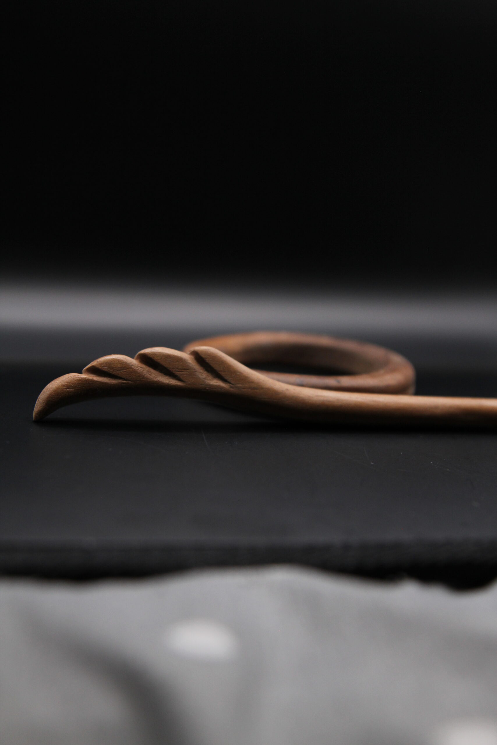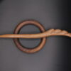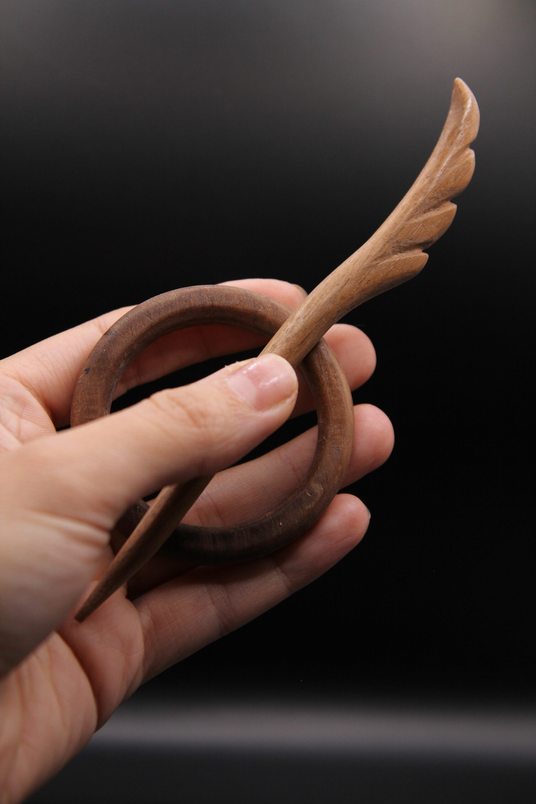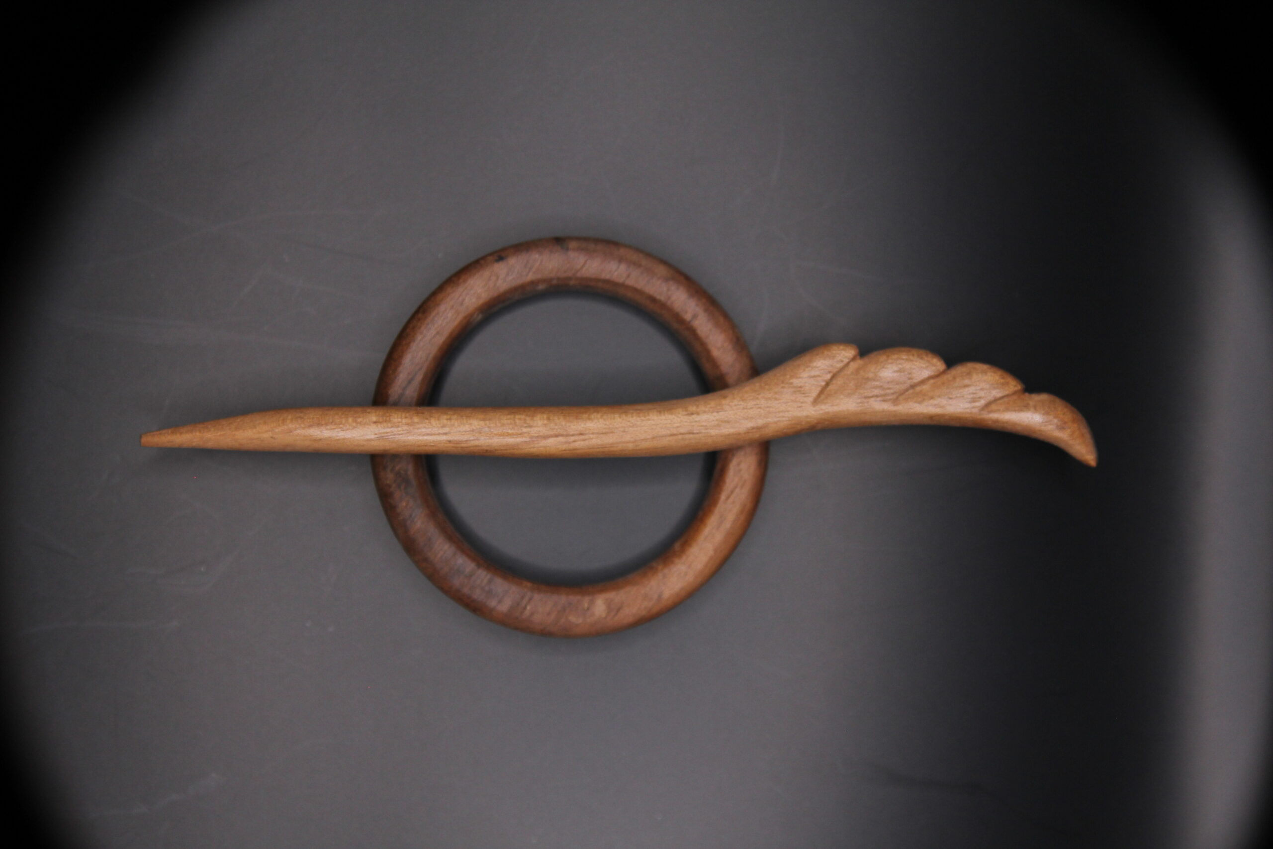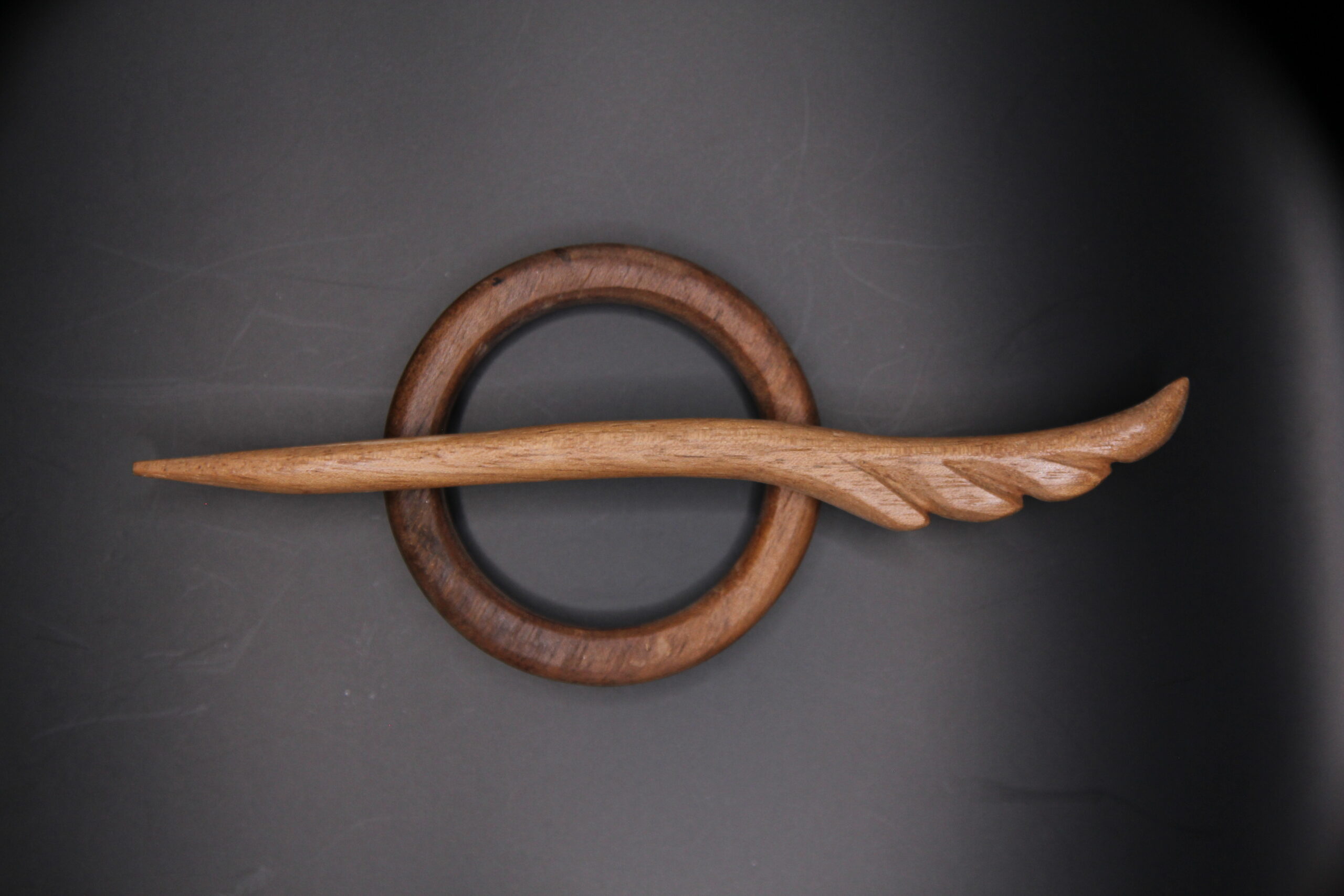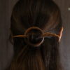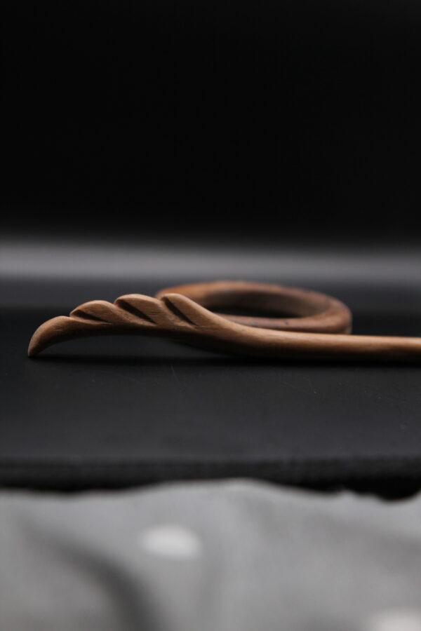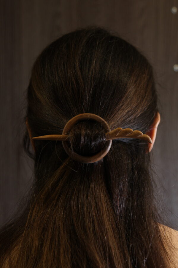 Handcrafted circular Kanzashi hair pin in oiled walnut wood, bold and minimalist in design.