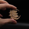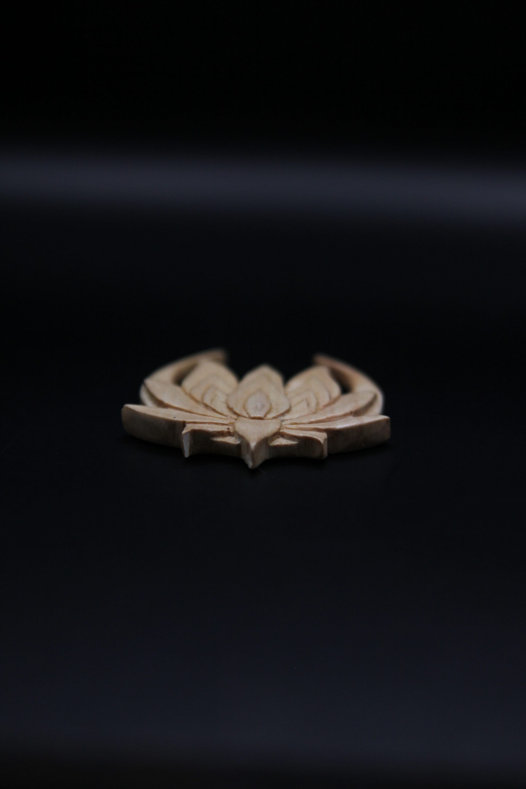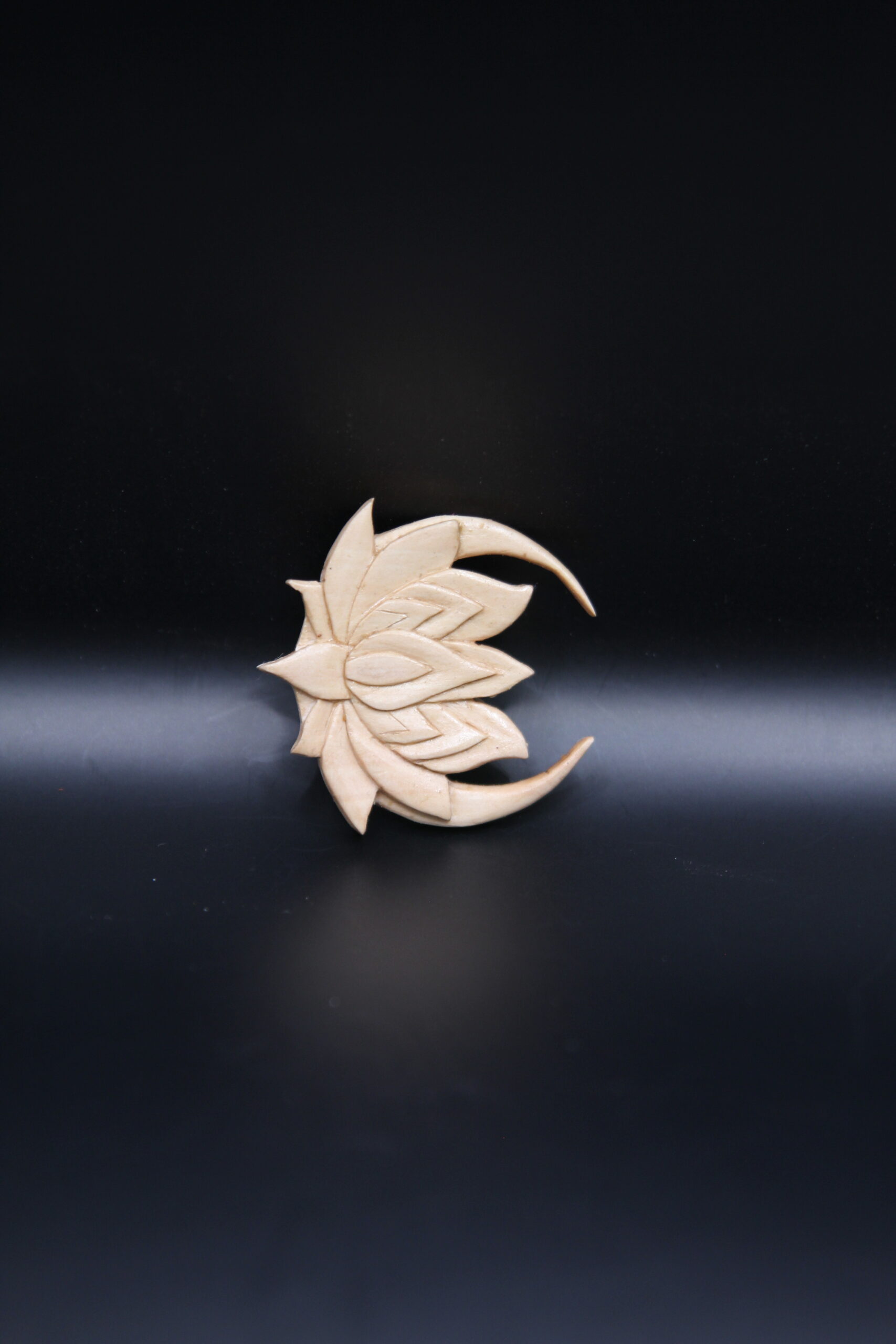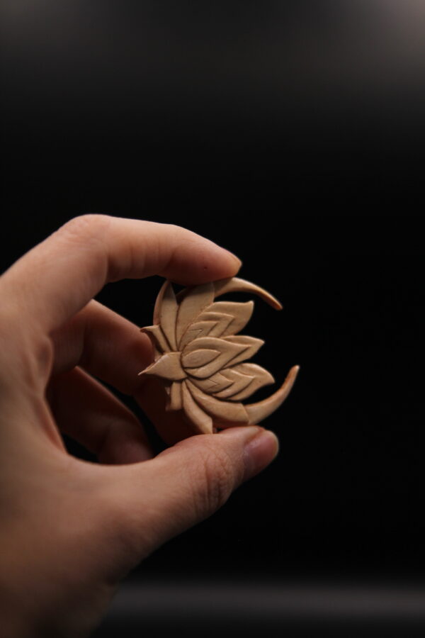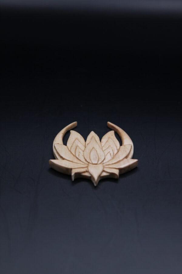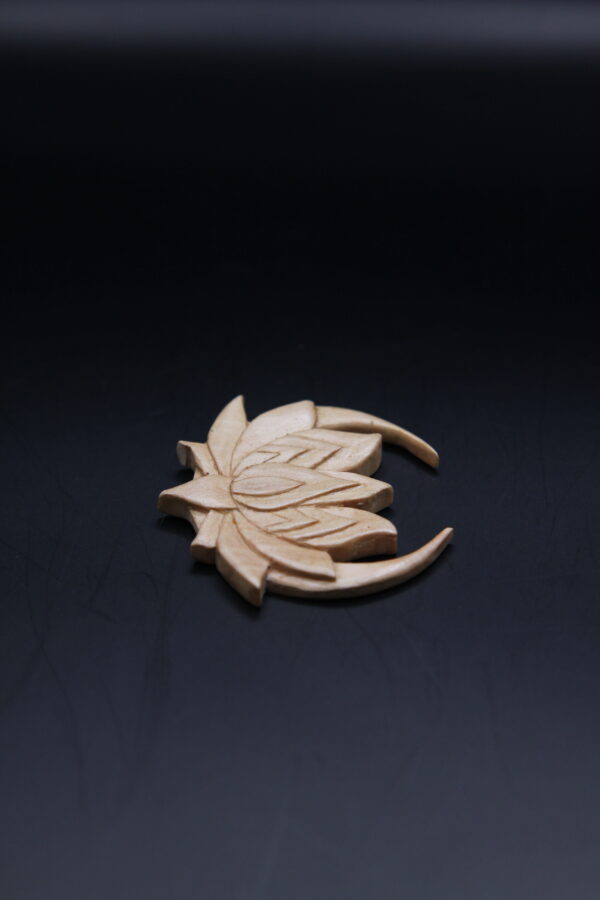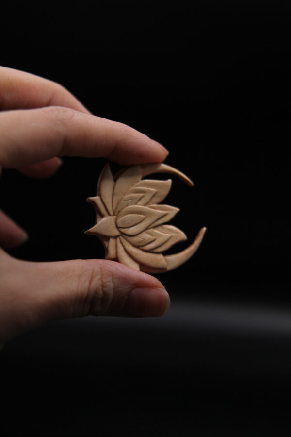 Hand-carved lotus flower on a crescent moon pendant in pale pear wood, a celestial symbol of growth and beauty.