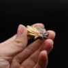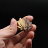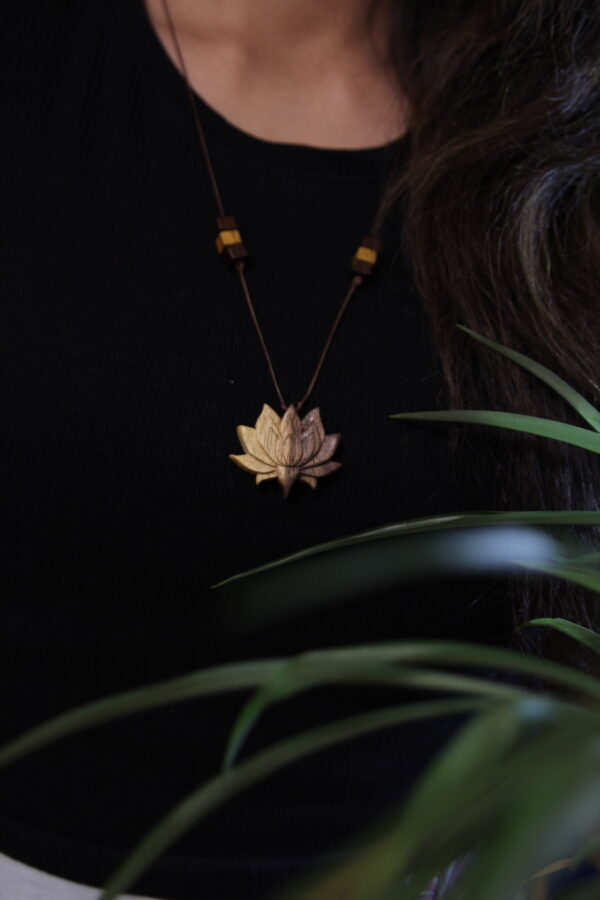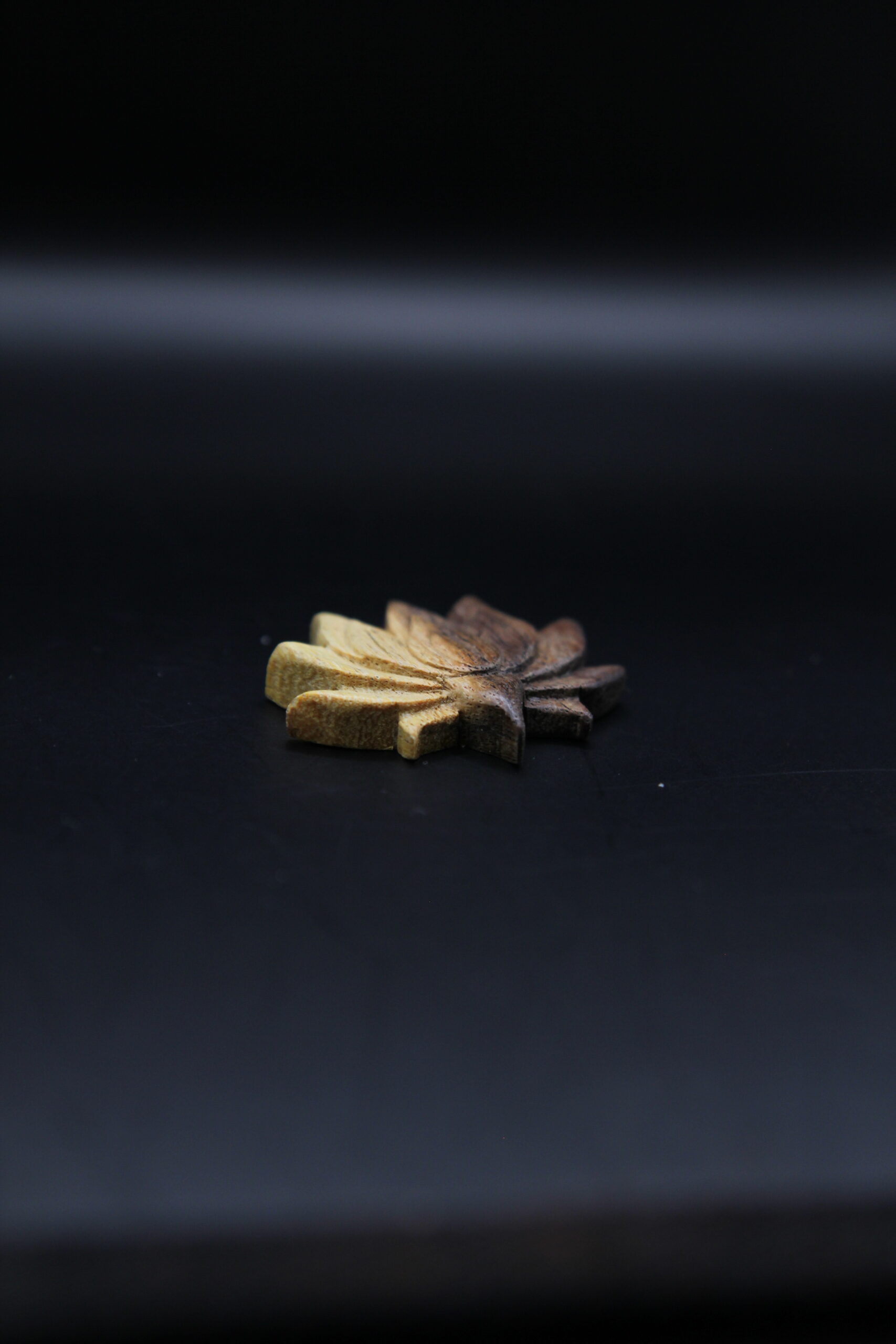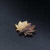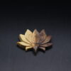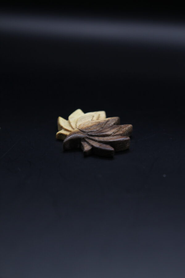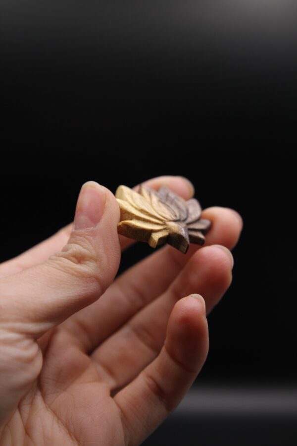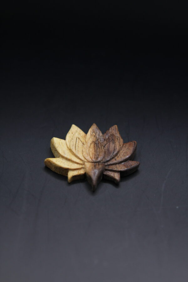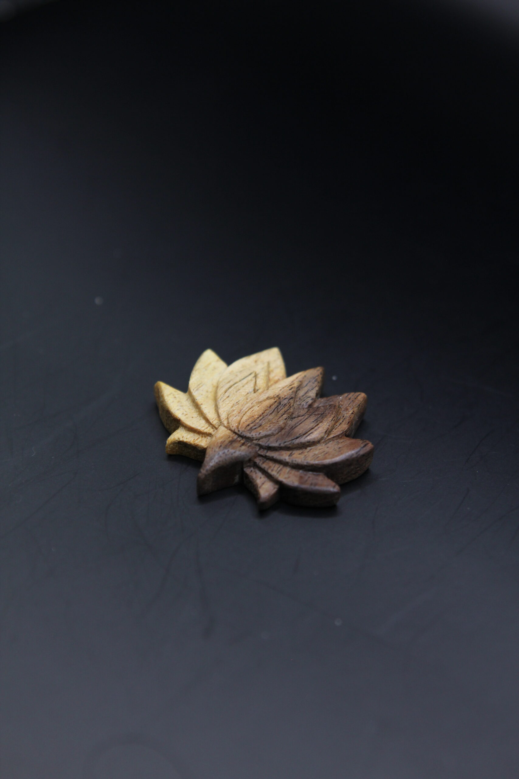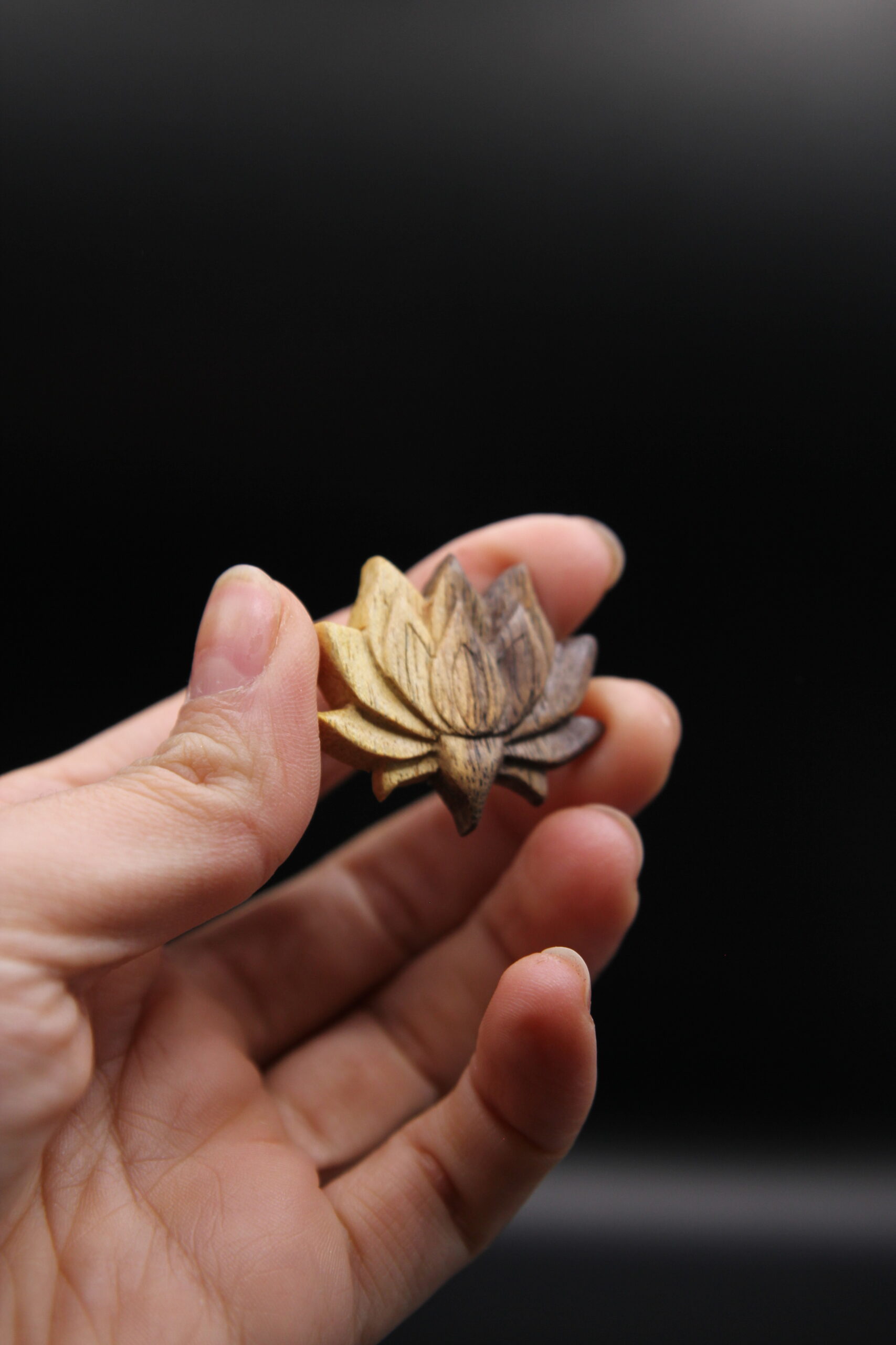 A tiny hand-carved lotus flower pin crafted from light, natural-toned wood with beautiful visible grain patterns. Small enough to hold between two fingers, this miniature lotus captures every petal in delicate detail. Its compact size makes it a versatile piece — wear it as a pin on a jacket, scarf, or bag for a subtle touch of handcrafted nature.