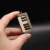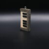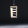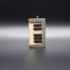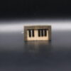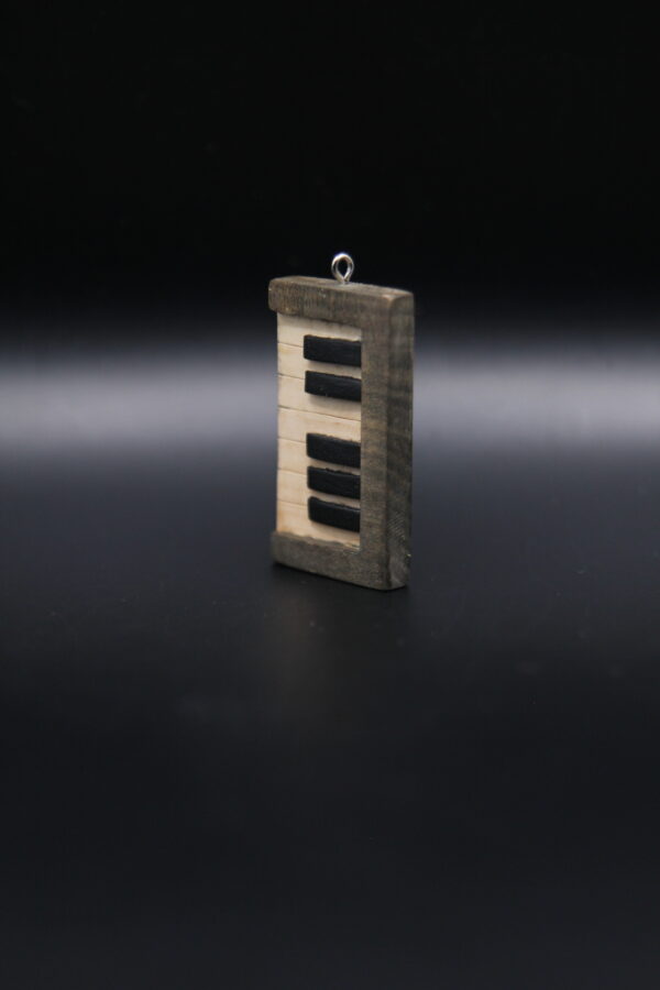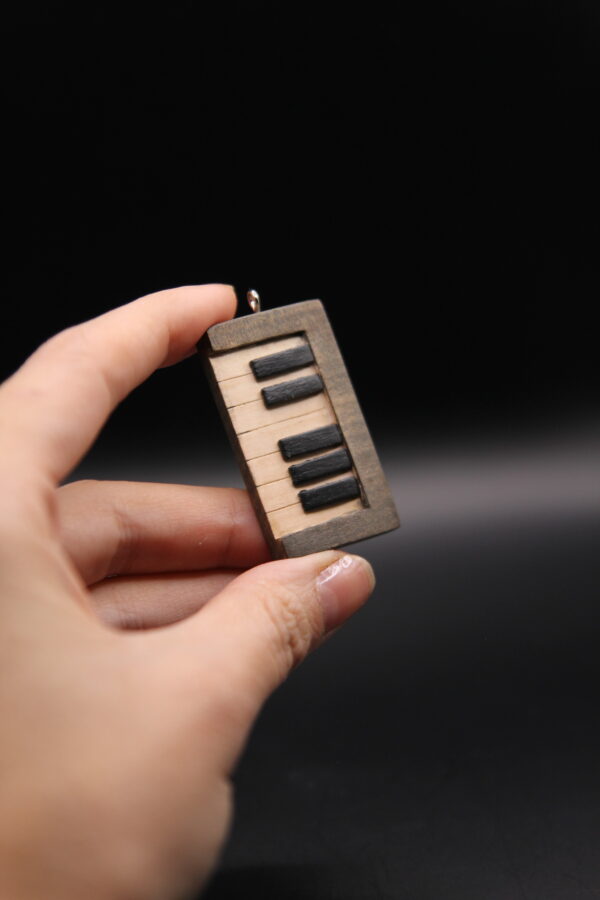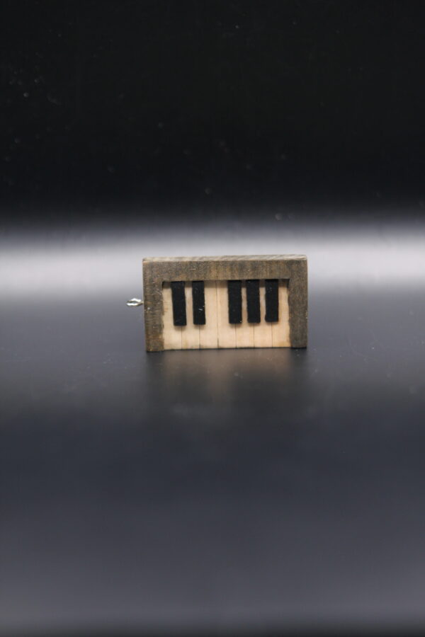 A hand-carved miniature piano keyboard pendant crafted from contrasting light and dark woods. This variation features a slightly larger design with bold black keys set against pale white keys, framed in warm-toned wood. A unique piece for music enthusiasts.