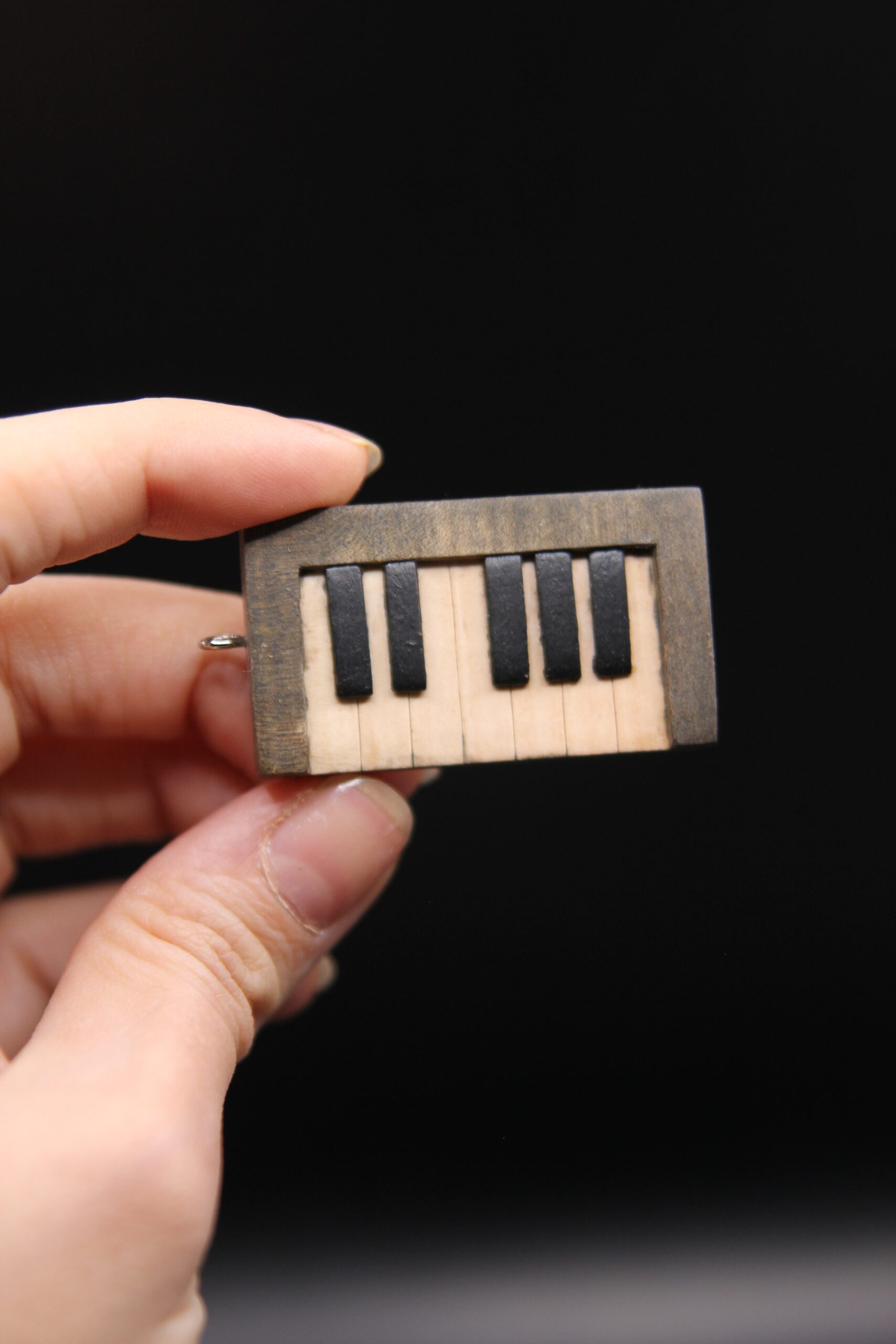 A hand-carved miniature piano keyboard pendant crafted from contrasting light and dark woods. This variation features a slightly larger design with bold black keys set against pale white keys, framed in warm-toned wood. A unique piece for music enthusiasts.