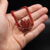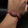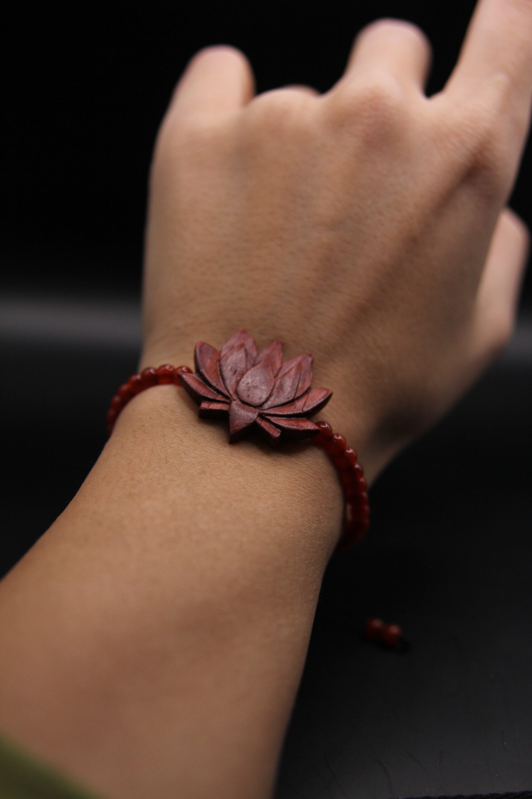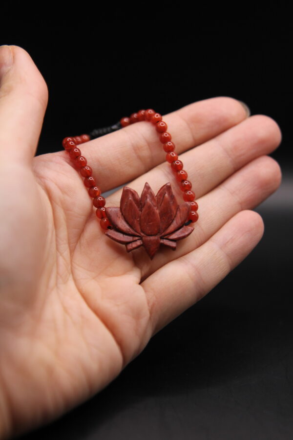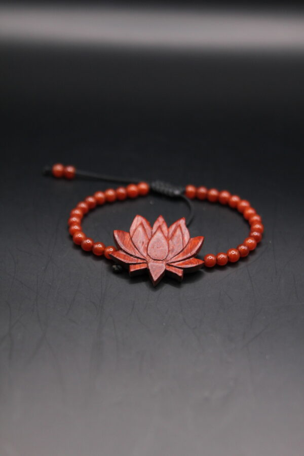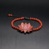 Handcrafted beaded bracelet with a carved red lotus flower centerpiece, made from rich reddish wood.