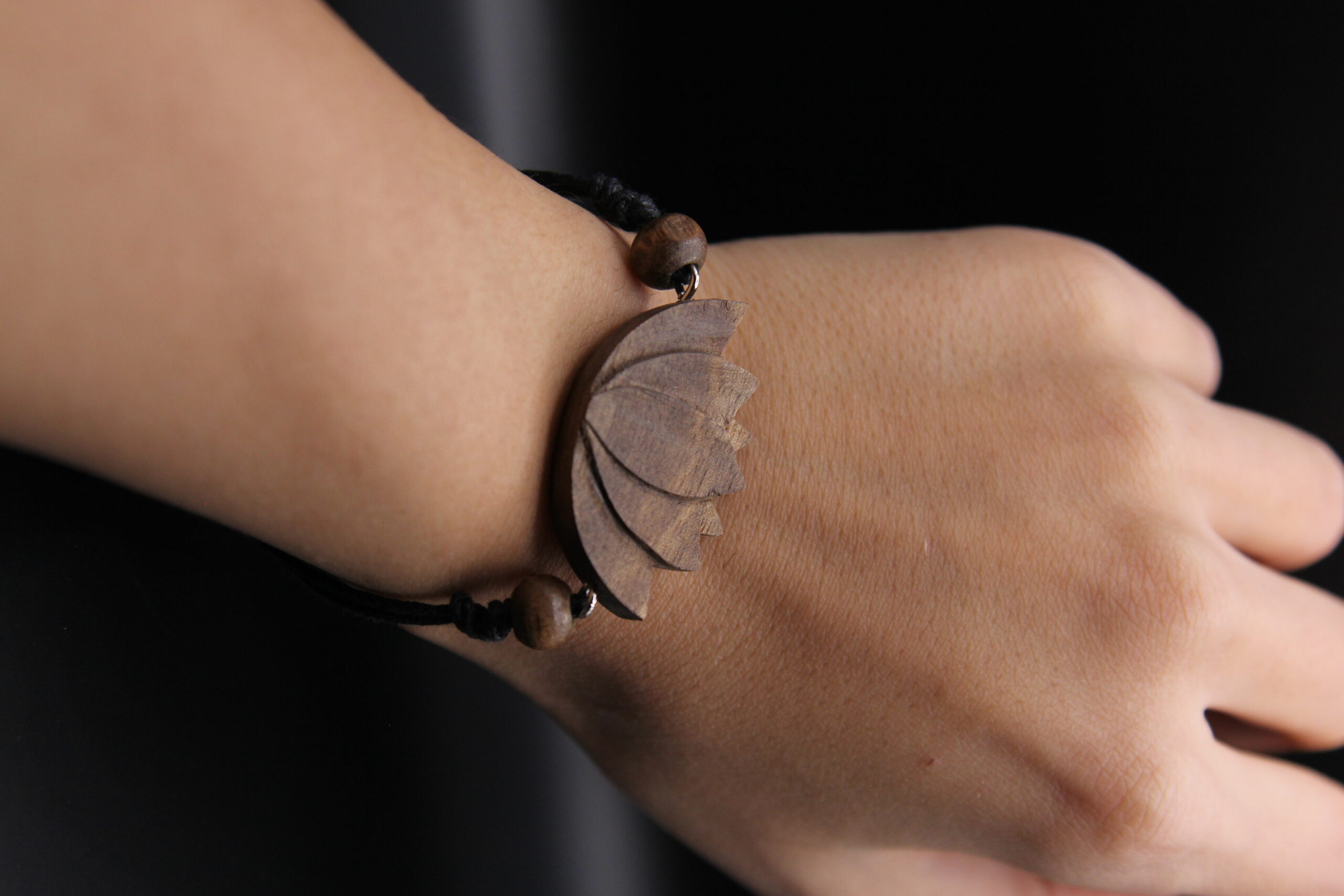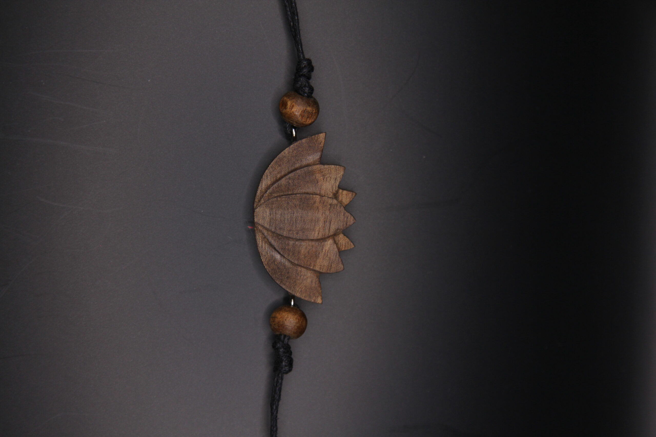 Petite hand-carved lotus flower pendant in walnut wood on a cord, a symbol of purity and elegance.