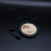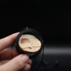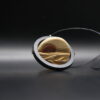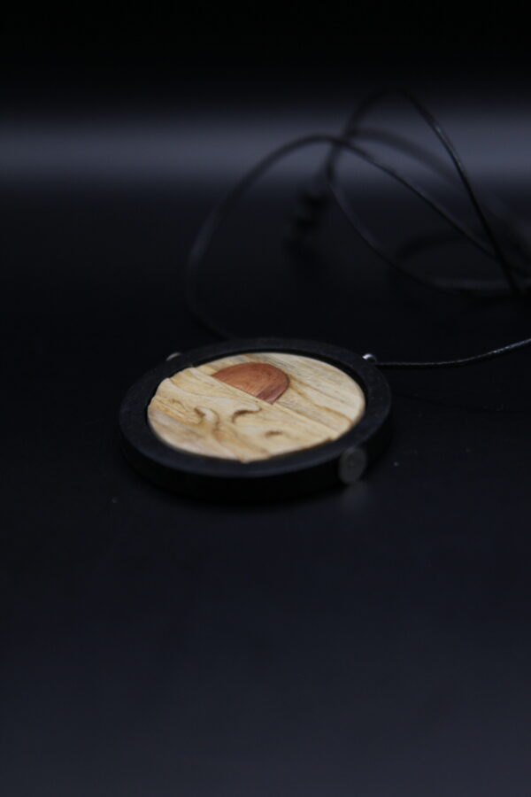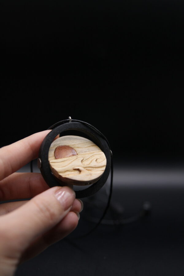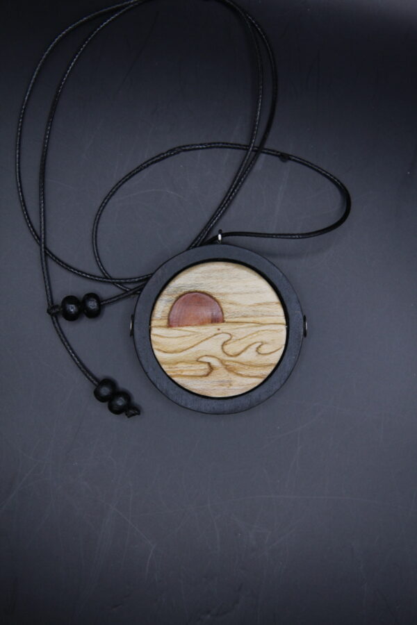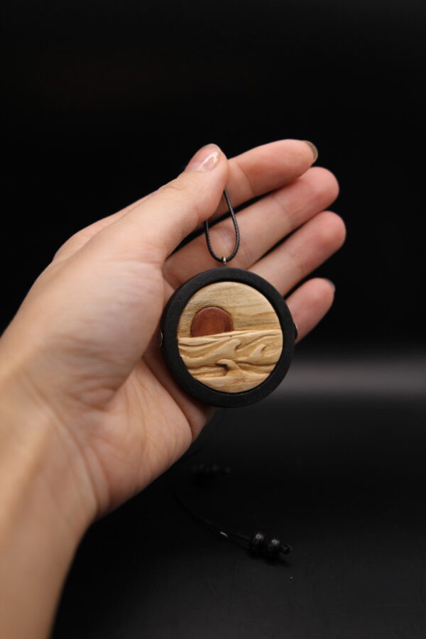 A hand-carved circular pendant depicting a sun setting over water, framed in a ring of dark ebony wood. The inner scene is carved from lighter wood, with delicate waves and a warm sun creating a serene landscape in miniature. The contrast between the dark frame and the golden interior gives this piece a striking, eye-catching look. Strung on a cord with handmade beads, it’s a wearable piece of art that carries the calm of nature wherever you go.