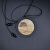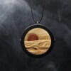 Hand-carved sun and water landscape pendant framed in dark ebony wood, strung on a beaded cord.