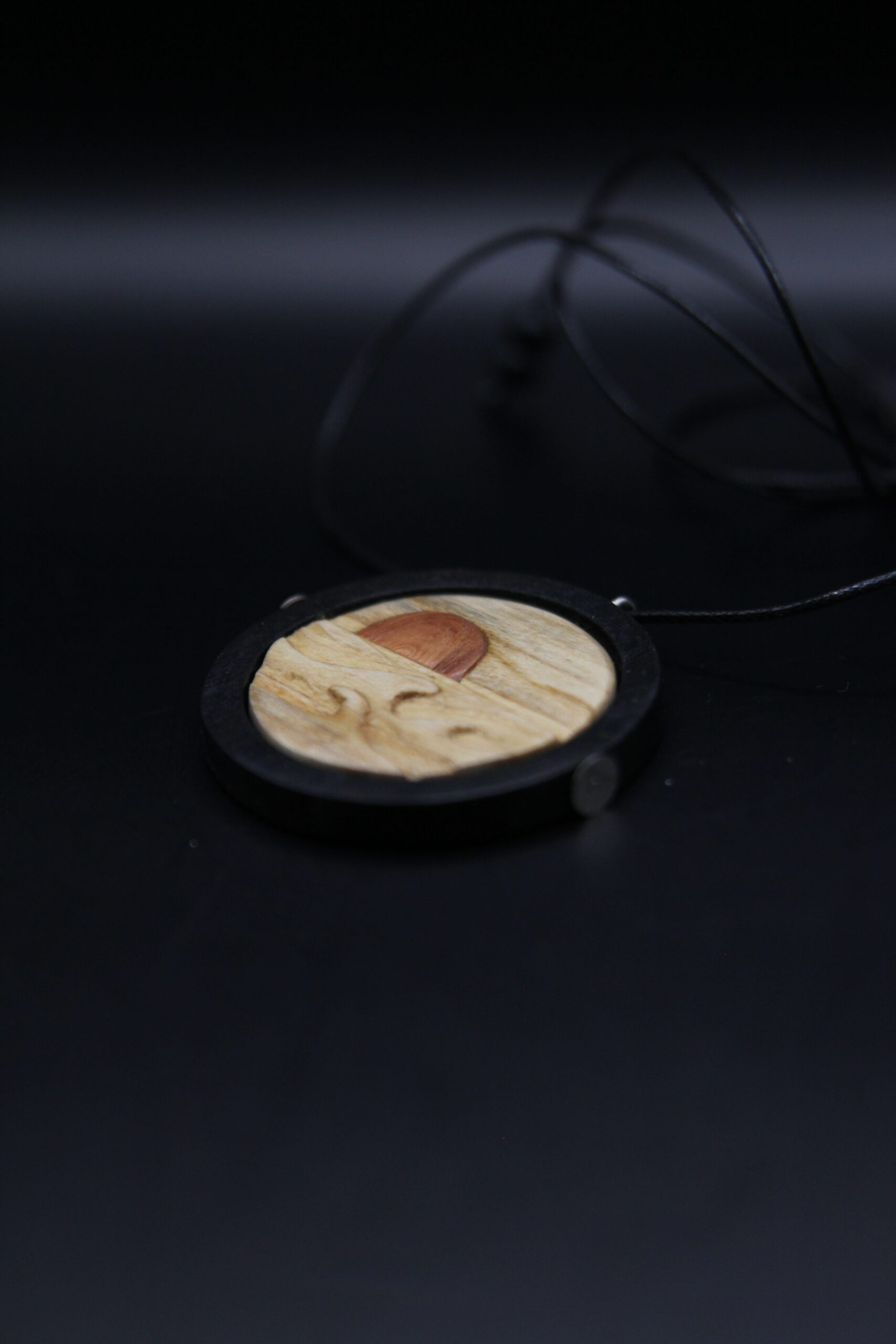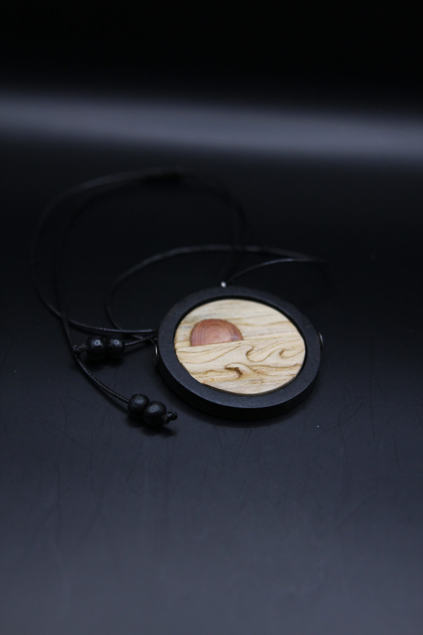 A hand-carved circular pendant depicting a sun setting over water, framed in a ring of dark ebony wood. The inner scene is carved from lighter wood, with delicate waves and a warm sun creating a serene landscape in miniature. The contrast between the dark frame and the golden interior gives this piece a striking, eye-catching look. Strung on a cord with handmade beads, it’s a wearable piece of art that carries the calm of nature wherever you go.