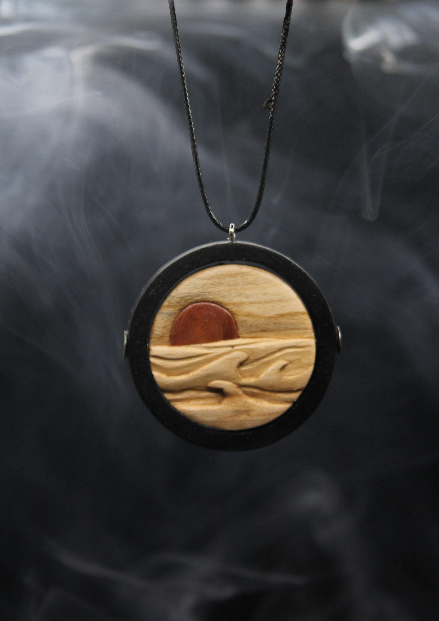 Hand-carved sun and water landscape pendant framed in dark ebony wood, strung on a beaded cord.
