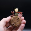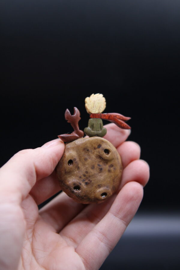 A delicate hand-carved wooden pin inspired by The Little Prince, featuring the iconic character crafted from burl wood with colorful accents. The rich, spotted texture of the burl wood gives the piece a planet-like quality, while the tiny scarf and hair details are carved from contrasting woods.