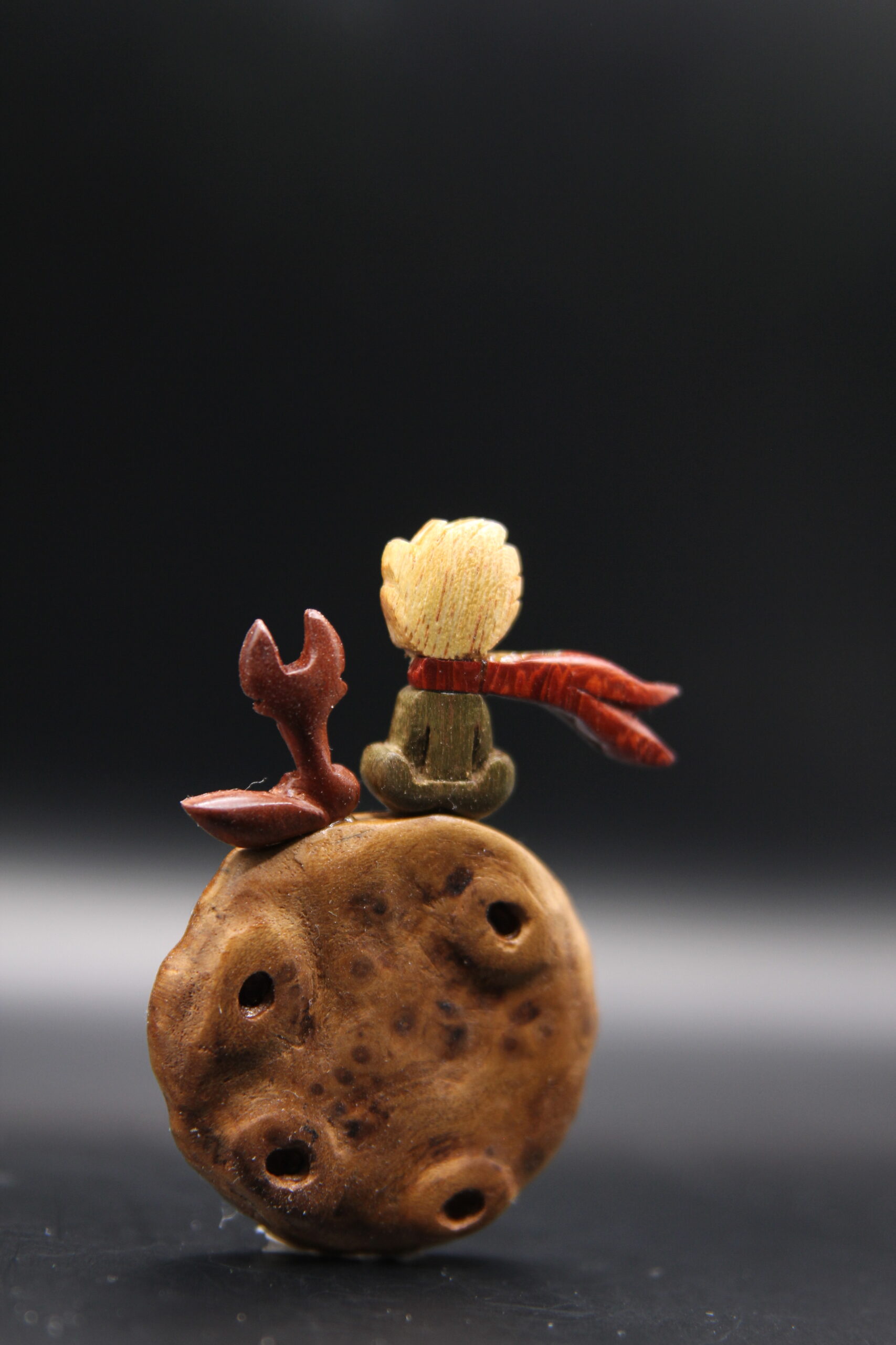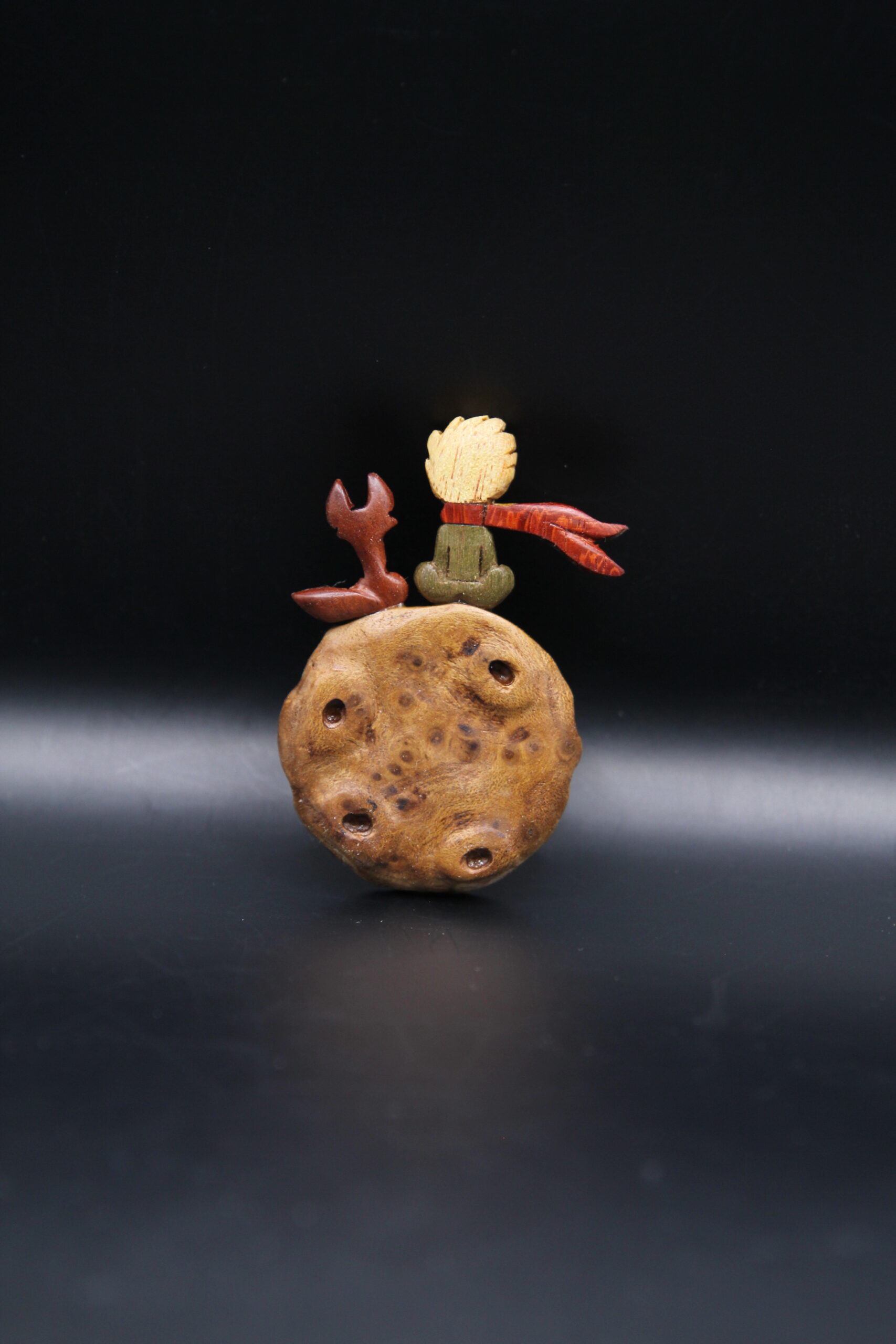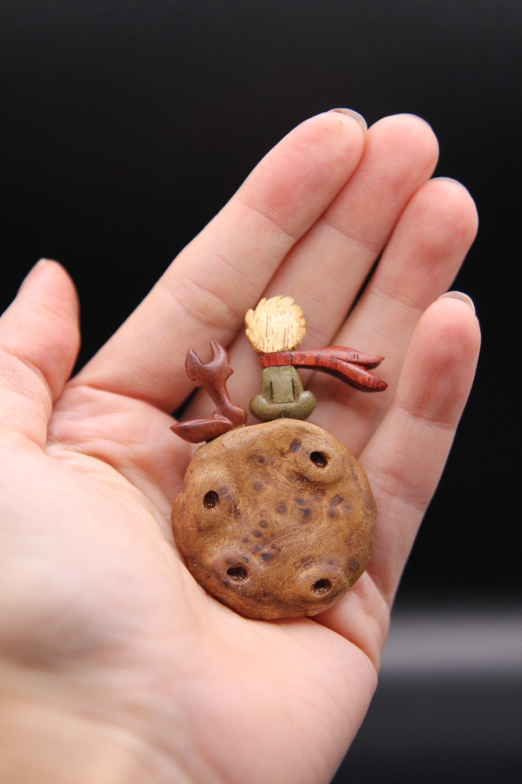 A delicate hand-carved wooden pin inspired by The Little Prince, featuring the iconic character crafted from burl wood with colorful accents. The rich, spotted texture of the burl wood gives the piece a planet-like quality, while the tiny scarf and hair details are carved from contrasting woods.